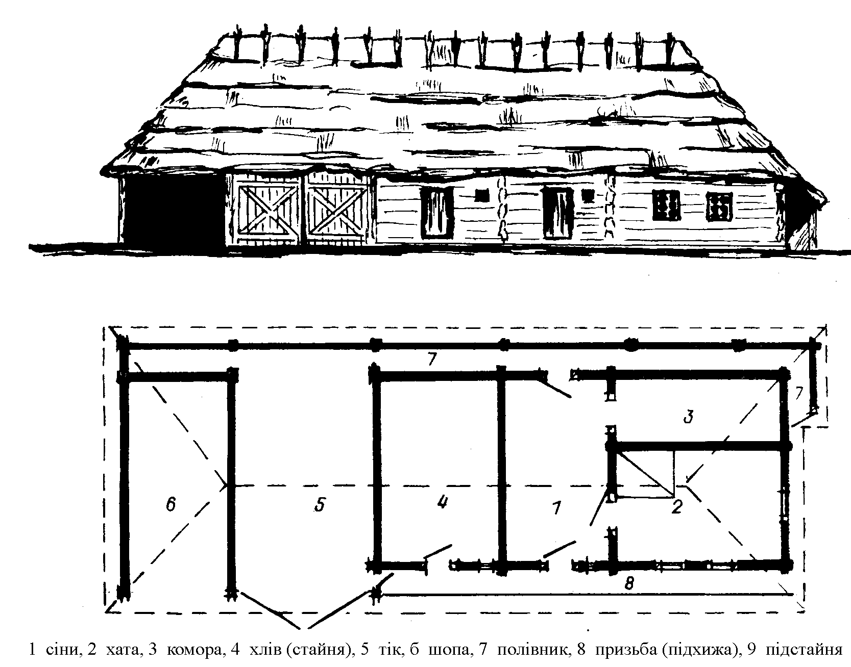 1 – сіни, 2 – хата, 3 – комора, 4 – хлів (стайня), 5 – тік, 6 – шопа, 7 – полівник, 8 – призьба (підхижа), 9 – підстайня.