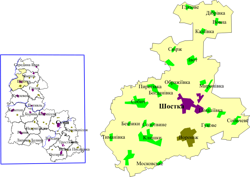 Верховна Рада України постановляє (21.10.2010, № 2627-VI): Верховна Рада України постановляє: 1. Включити в межі міста Шостка Сумської області 321,87 гектара земель, які знаходяться у віданні Ковтунівської сільської ради, 84,20 гектара земель – Ображіївської сільської ради, 14,00 гектара земель – Миронівської сільської ради, 391,75 гектара земель, які знаходяться у віданні Гамаліївської сільської ради Шосткинського району, та затвердити територію міста Шостка загальною площею 4368,82 гектара і територію Шосткинського району загальною площею 121089,18 гектара. 2. Встановити межі міста Шостка Сумської області згідно з додатком ( 2627а-17 ).