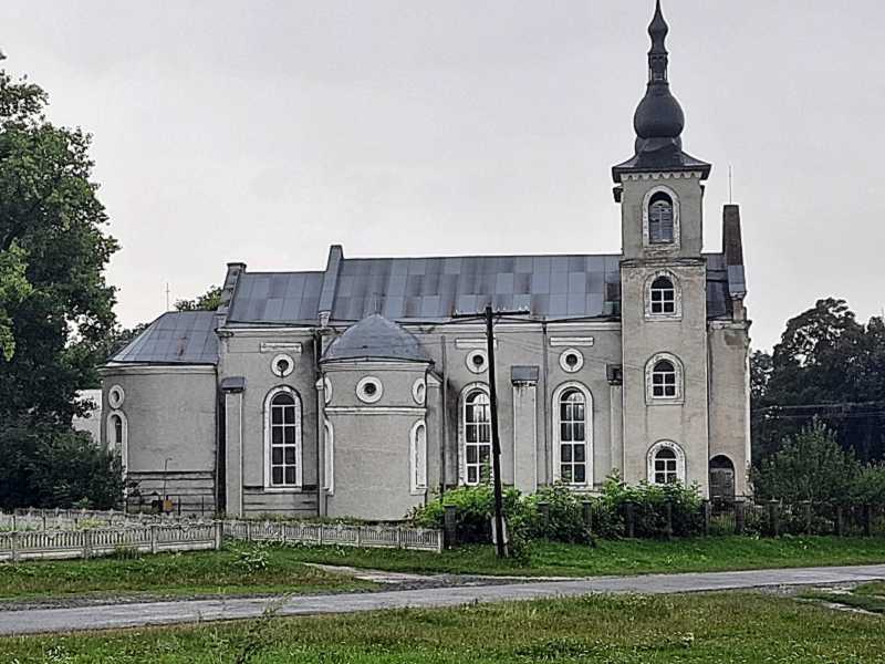 Солобківці. Костел в центрі села, при дорозі до Зінькова, орієнтація вівтаря 65°. Спостереження М.І.Жарких, 26 липня 1995 р.
