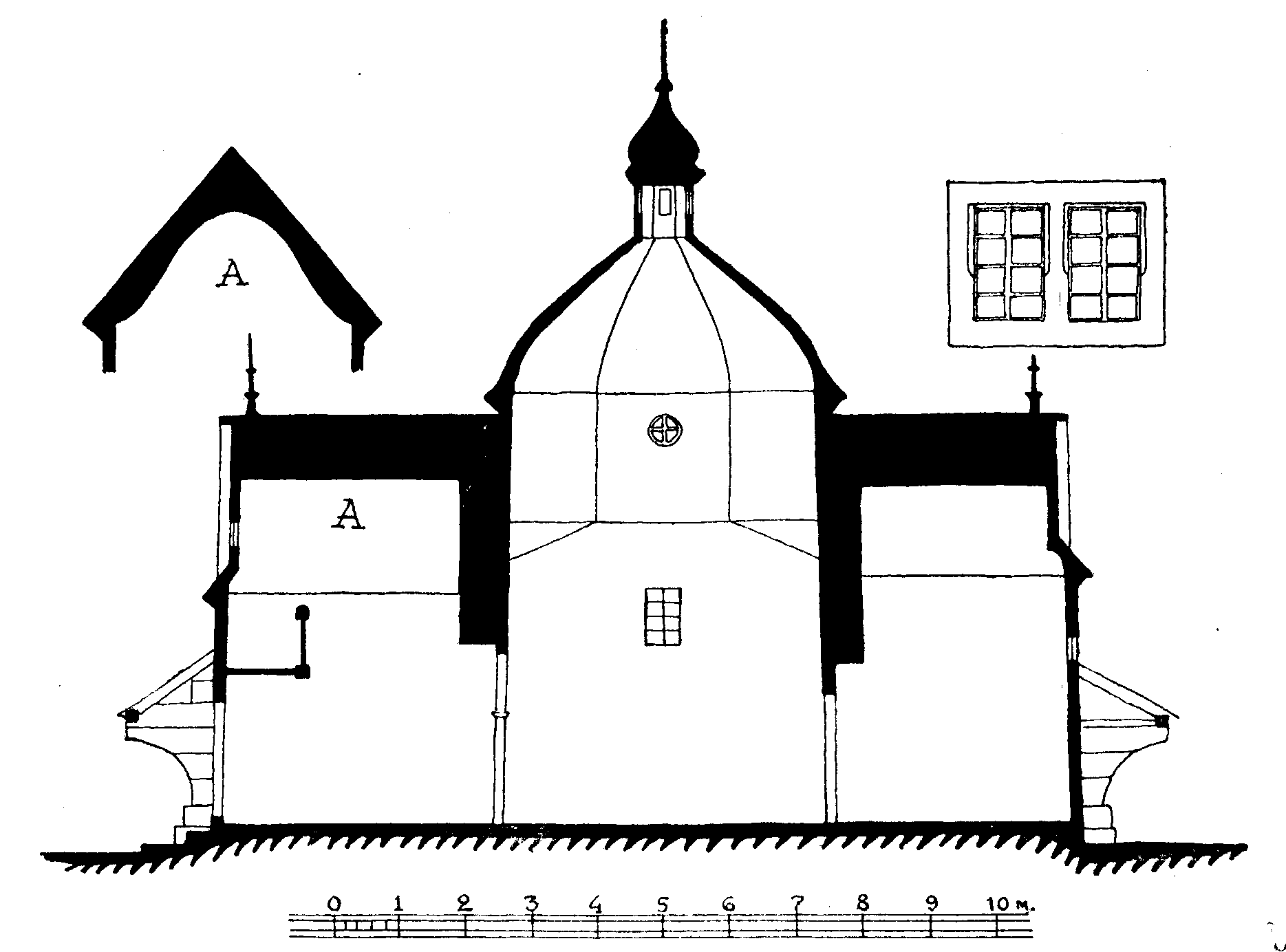 Перекрій:церкви в Старому Селі. А) Профіль стелі в жіночнику. На право в горі – деталь південного вікна голов. бані (вид із середини)