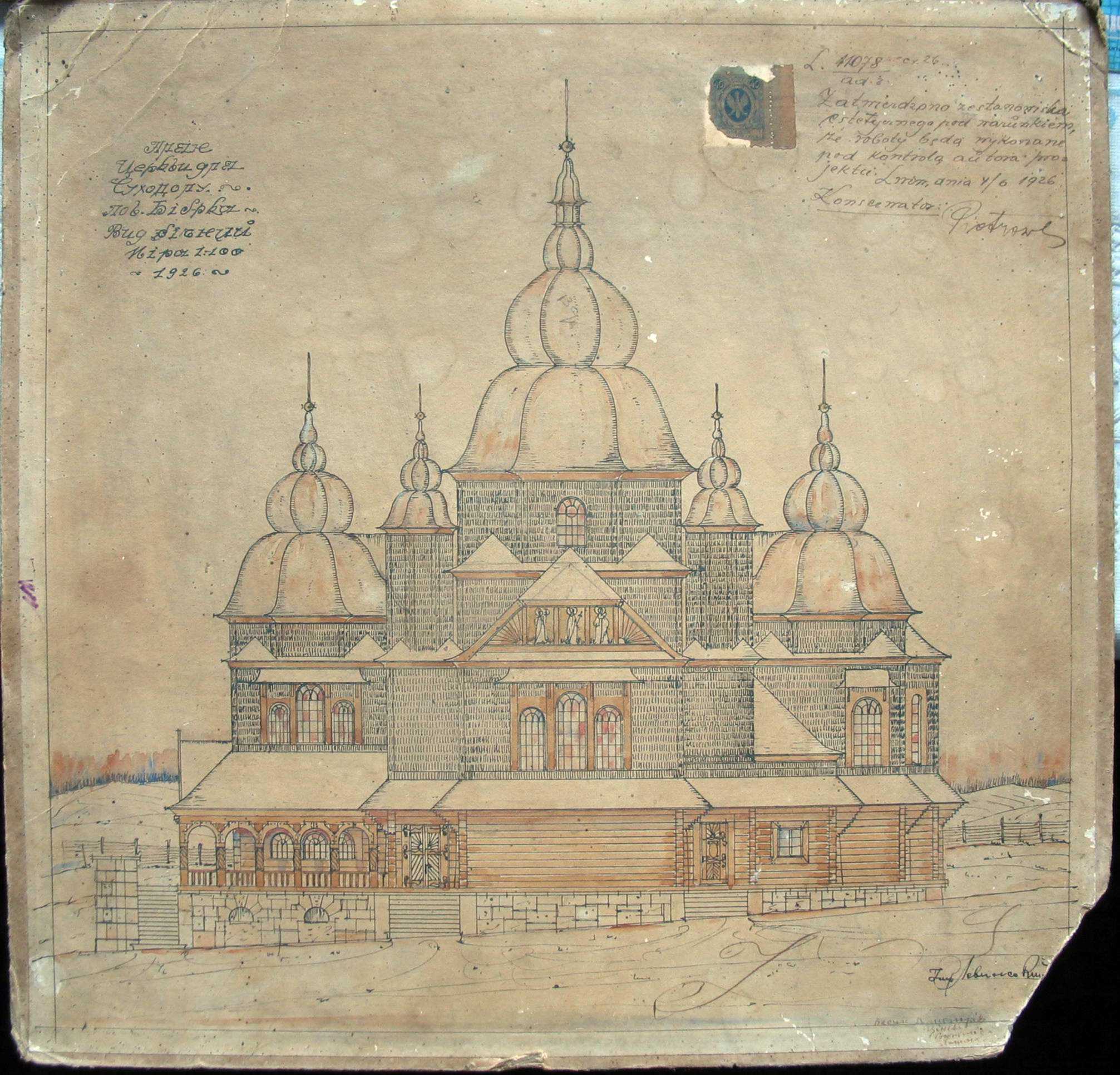 1926 р. Бічний фасад церкви. ПроектРозмір зображення: 2013:1933 піксел Фото Зенона Боровця і Богдана Тхора, 13 серпня 2008 р. |