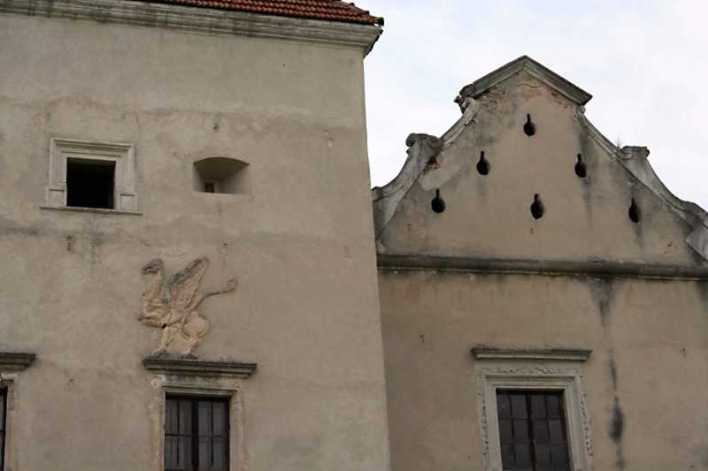 Фронтон має три (!) яруси бійниць – схожин на бійниці 16 ст. для вогнепаольної зброї, але всі ці – декоративні. Реально можна стріляти тільки з одного яруса.