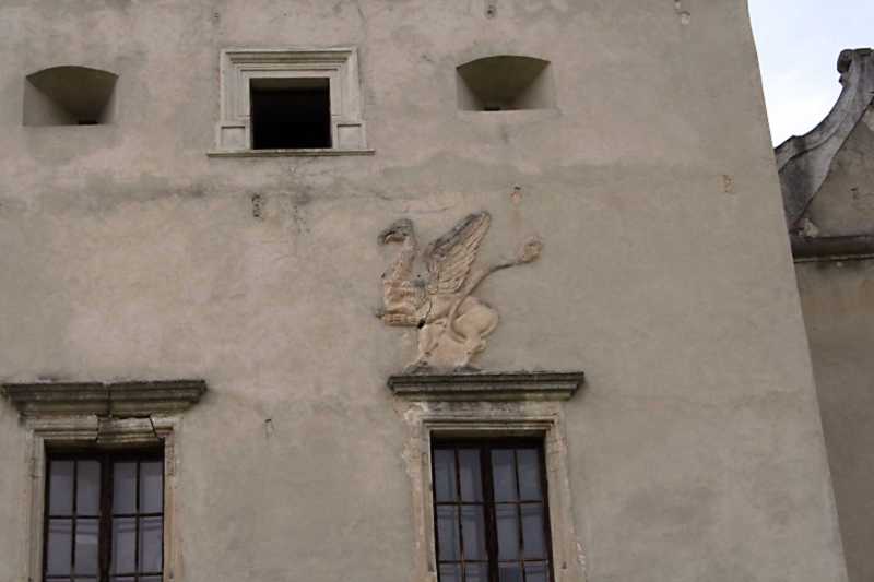 Фрагмент башти з рельєфом звіраРозмір зображення: 800:533 піксел Фото Зенона Боровця і Богдана Тхора, 11 серпня 2009 р. |