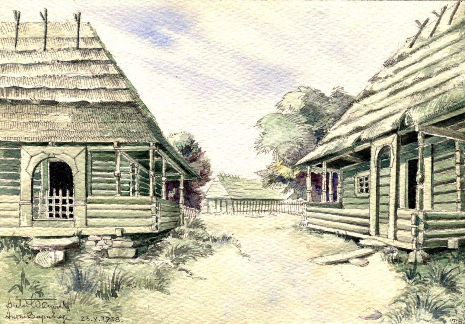 1938 р. Вигляд хат з дорогиРозмір зображення: 1541:1073 піксел Рисунок Антона Вариводи (Краків), 23.05.1938 р. 1718 Dwelling, Tukhol’ka (Tucholka), Drohobych, Ukraine. View of houses by the road. |