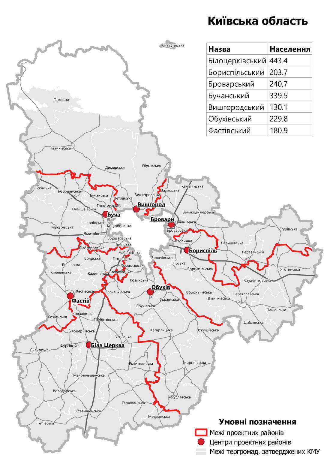 В 1932 р. частина її території була передана до складу Харківської області, інша частина – до складу новоутвореної Чернігівської області. В тому ж 1932 р. до складу Київської області передано частину Вінницької області. В 1937 р. частини Київської області були передані до складу Вінницької області, Київської міської ради та новоутворених Житомирської і Полтавської областей. В 1939 р. частина території Київської області була передана до складу новоутвореної Кіровоградської області. В 1954 р. частина території Київської області була передана до складу новоутвореної Черкаської області; натомість до Київської області було приєднано частину Полтавської області. В 1987 р. до Київської області було приєднано частину Чернігівської області. В 1988 р. частина Київської області була передана до складу Київської міської ради.