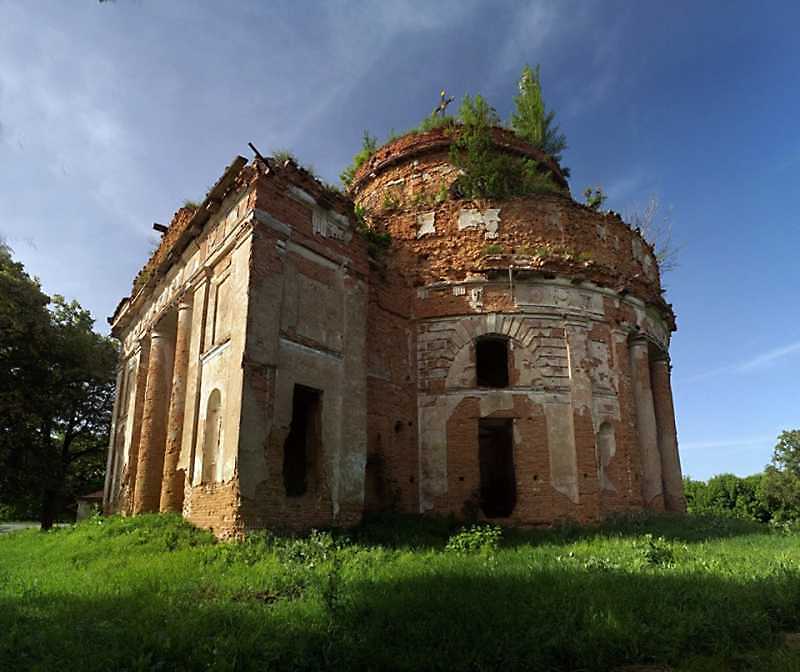 РОЖДЕСТВЕНСКАЯ ЦЕРКОВЬ, 1801-1807 гг. Сооружение кирпичное, оштукатуренное, круглое в плане, с небольшой прямоугольной апсидой и западным притвором, одноглавое. С юга, запада и севера входы оформлены дорическими портиками. Верхнюю часть стен опоясывает классический лепной фриз с гирляндами и урнами. Таким же фризом украшен и верх барабана. В основной зал ведут семь обрамленных ионическими колоннами входов, перекрытых арками. [Памятники градостроительства и архитектуры УССР. – К.: Будівельник, 1985 г., т. 3, с. 296]