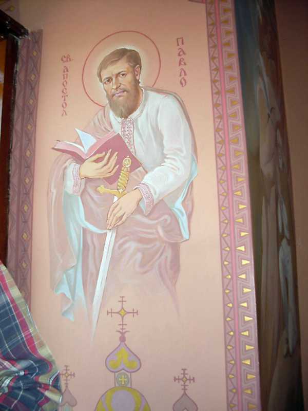 Стінопис «Апостол Павло» Розмір зображення: 600:800 піксел Фото Зенона Боровця і Богдана Тхора, 17 липня 2016 р. Вкладені елементи Півпостать св. Павла