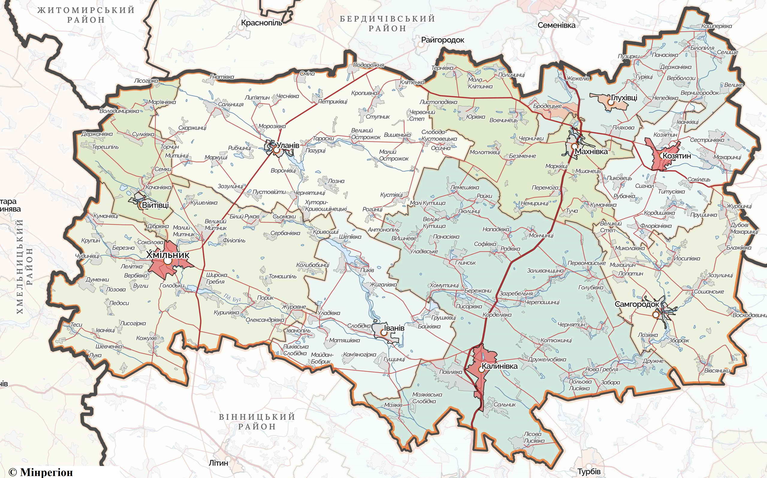 Район утворено постановою Верховної Ради України від 17 липня 2020 р. «Про утворення та ліквідацію районів» (з адміністративним центром у місті Хмільник) у складі територій Глуховецької селищної, Жданівської сільської, Іванівської сільської, Калинівської міської, Козятинської міської, Махнівської сільської, Самгородоцької сільської, Уланівської сільської, Хмільницької міської територіальних громад, затверджених Кабінетом Міністрів України