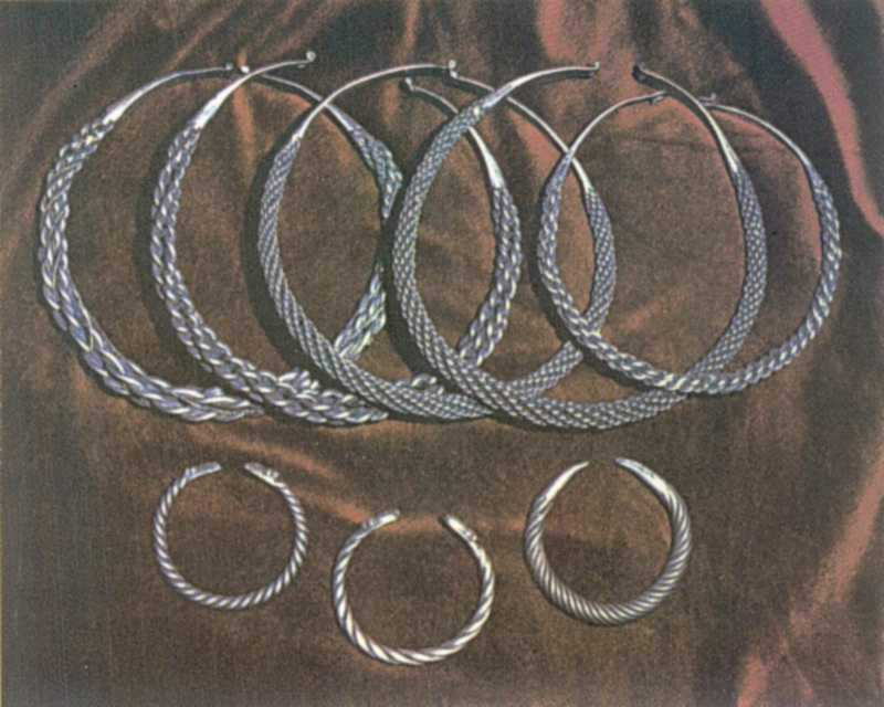 Гривни та браслети зі скарбуРозмір зображення: 800:640 піксел Гривни та браслети зі скарбу (XI ст., с. Городище Волинської обл.). Джерело: Історія української культури. – К.: 2001 р., т. 1, с. 931. |