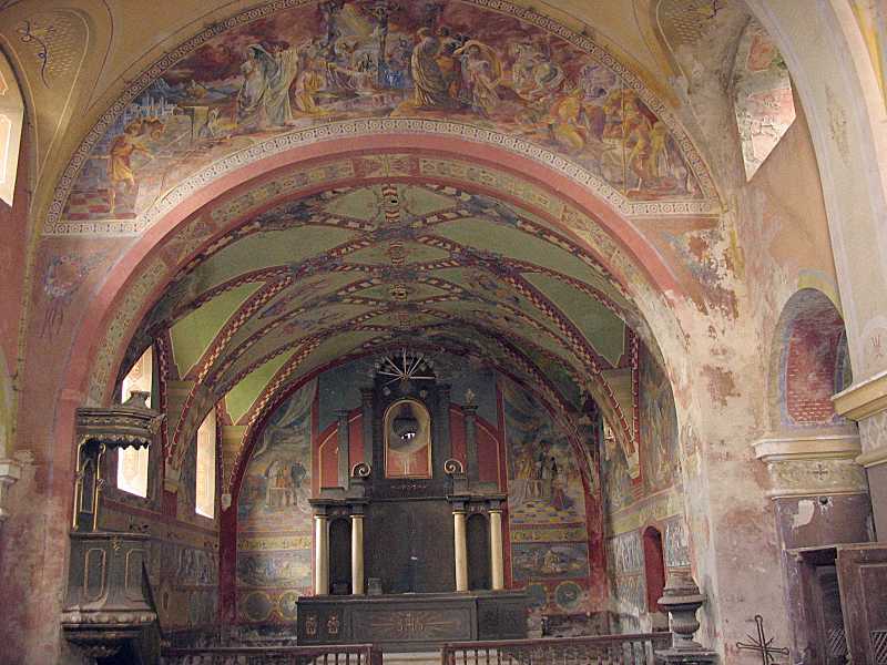 2006 р. Інтер’єр з видом на вівтар Розмір зображення: 800:600 піксел Фото Зенона Боровця, 5 вересня 2006 р. Вкладені елементи Стінопис лівої частини вівтарної стіни Стінопис правої частини вівтарної стіни Склепіння вівтаря (+) Стінопис лівої стіни вівтаря Вознесіння Стінопис правоі стіни вівтаря Тріумфальна арка зі сценою розп’яття (+) Пелікан Інтер’єр з видом на вхід та хори Інтер’єр купола каплиці