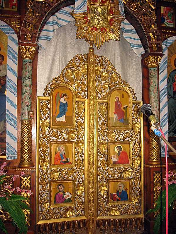 Царські врата Розмір зображення: 600:800 піксел Фото Зенона Боровця і Богдана Тхора, 6 серпня 2010 р. Вкладені елементи Ікона архангела Гавриїла з «Благовіщення» Ікона Марії з «Благовіщення» Ікони євангелістів