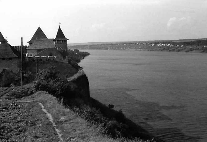 1991 р. Фрагмент замку і Дністровське водосховище. Вигляд з півдняРозмір зображення: 800:547 піксел 1991 р. 23 липня. Фото М.І.Жарких. Негатека, № 703-27. |
