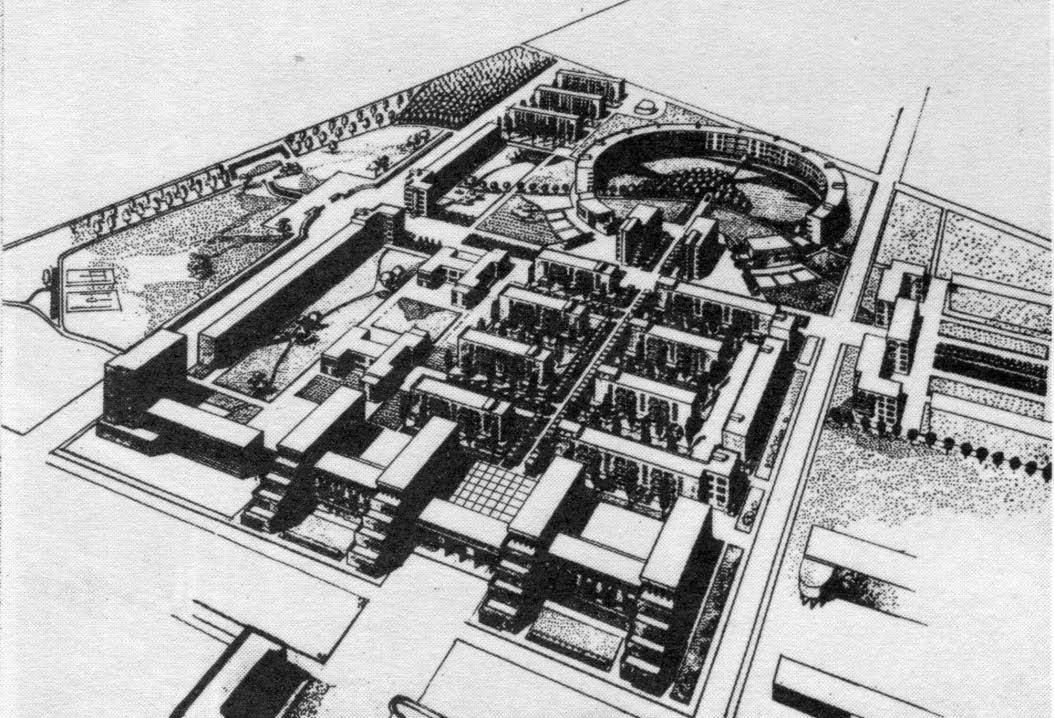 Будинки громадського призначення також не були зведені, але деякі композиційні знахідки з архітектури цих споруд, а саме: помережені круглими отворами площини, напівкруглі балкони тощо було перенесено авторами на будинки-пропілеї. З запланованих двох дитячих садків був побудований до війни тільки один – простий, прямокутний за планом.