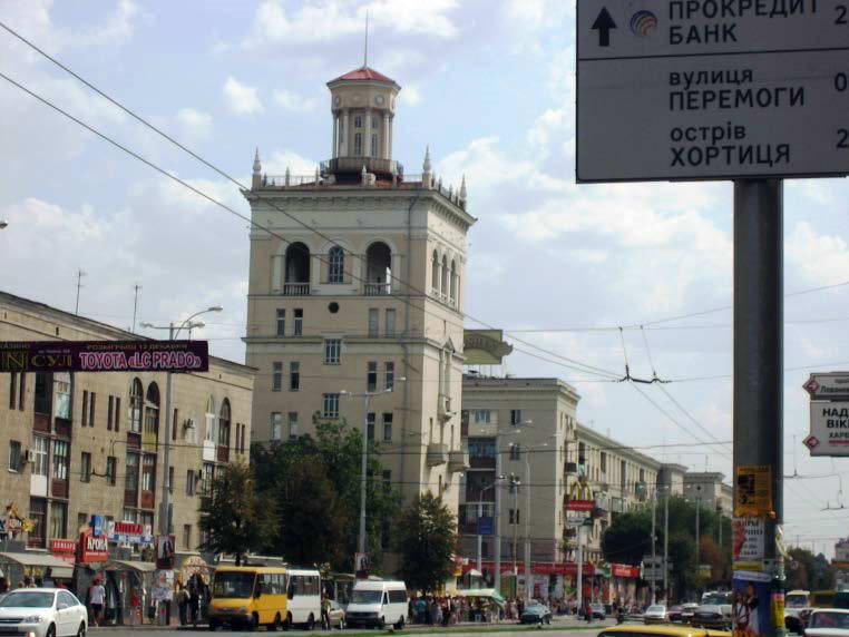 Житловий будинок, 1947-1949 (архіт.). Просп. Соборний, 220. На розі кварталу № 5 Шостого селища "Соцміста", утвореному перетином просп. Соборного та просп. Металургів. Автор – архітектор І. Козлінер.
