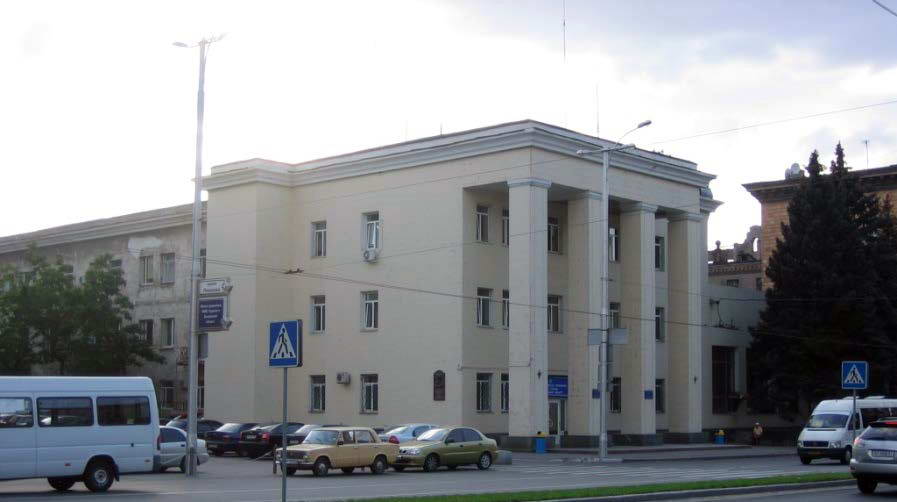 Будинок громадських організацій 1930 (архіт.). Просп. Соборний, 191. На розі просп. Соборного і вул. Леонова, на червоній лінії забудови вулиці. Архітектор С.Масліх.
