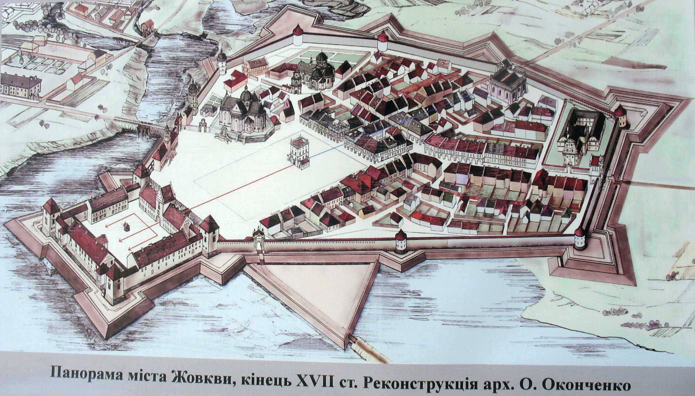 Кін. 17 ст. Ведута міста ЖовквиРозмір зображення: 2257:1287 піксел Фото Зенона Боровця і Богдана Тхора (1 вересня 2012 р.) з рисунка архітектора О. Оконченка. |