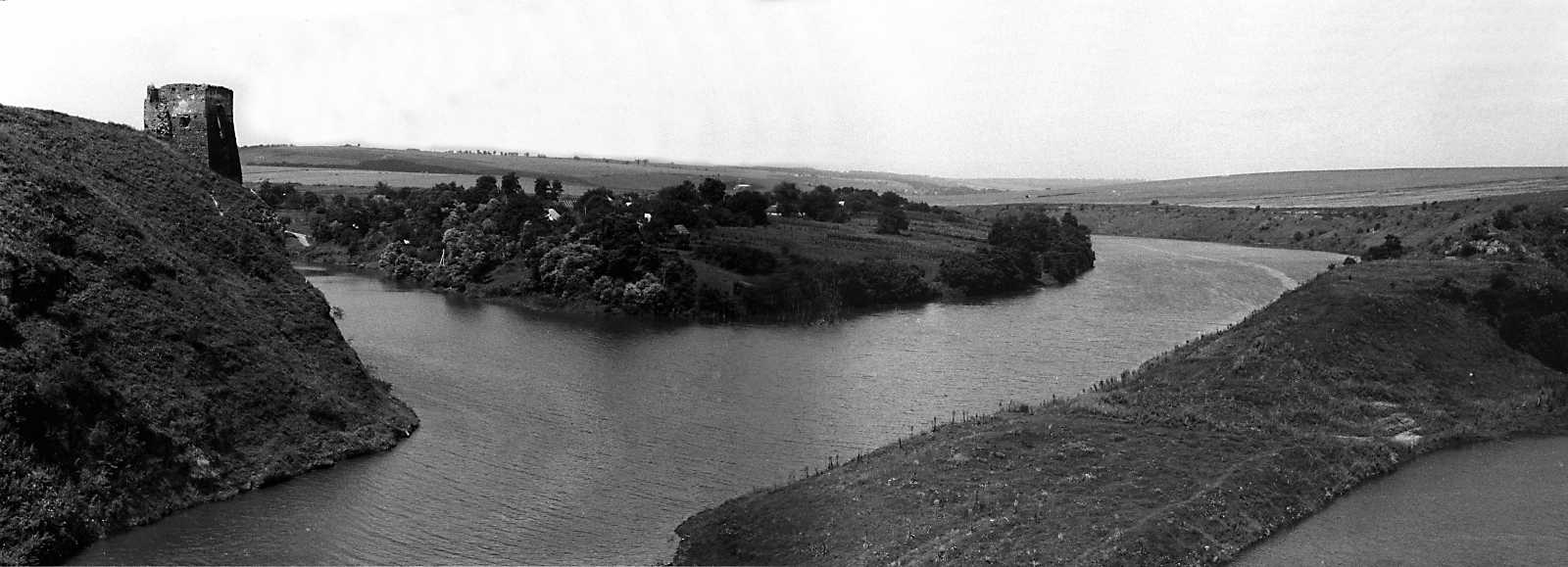 1991 р. Північна башта над р. Жванчик. Вигляд зі сходуРозмір зображення: 1600:579 піксел 1991 р. 23 липня. Фото М.І.Жарких. Негатека, № 696-36+7. |