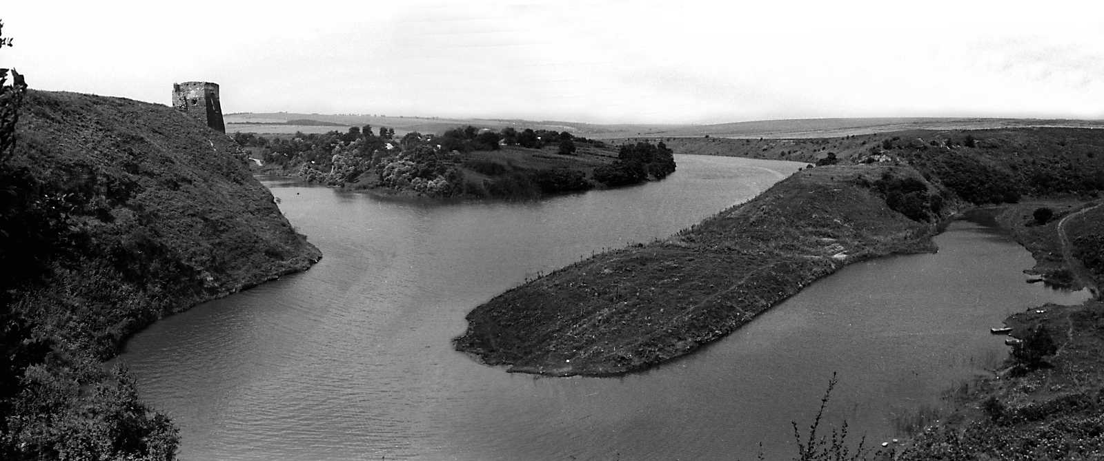 1991 р. Панорама замку і р. Жванчик зі сходуРозмір зображення: 1600:669 піксел 1991 р. 23 липня. Фото М.І.Жарких. Негатека, № 697-04+5. |