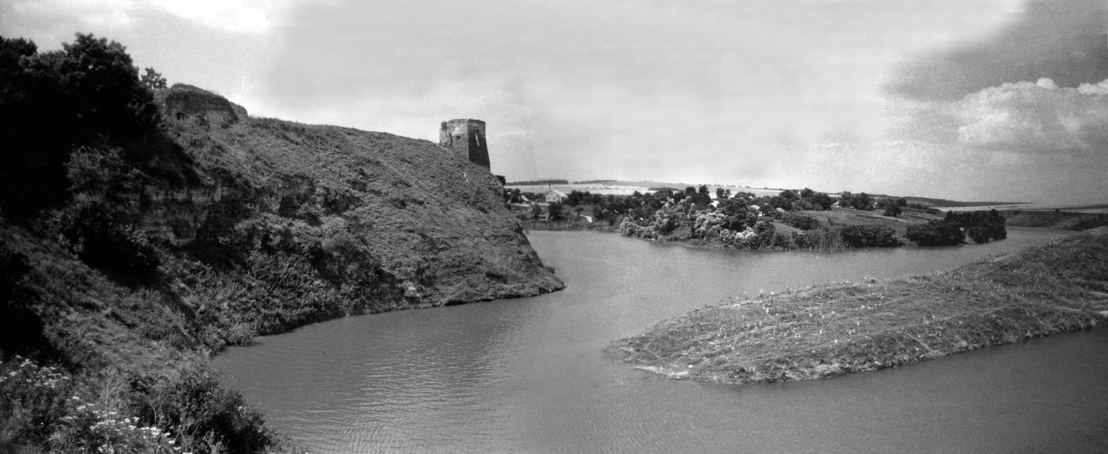 1991 р. Панорама замку і р. Жванчик зі сходуРозмір зображення: 1600:656 піксел 1991 р. 23 липня. Фото М.І.Жарких. Негатека, № 697-11+2. |