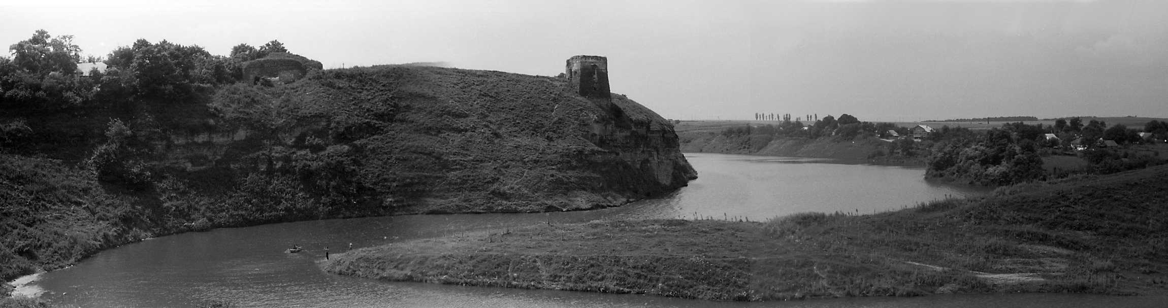 1991 р. Панорама замку і р. Кармелітанка зі сходуРозмір зображення: 2300:607 піксел 1991 р. 23 липня. Фото М.І.Жарких. Негатека, № 698-05+7. |