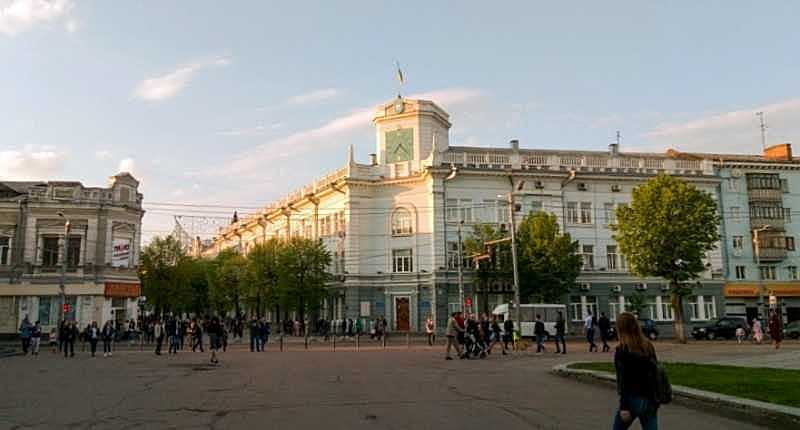 Справа – здание мэрии. В 1900 году на этом месте двухэтажный дом построило «Житомирское общество взаимнаго кредита», членом которого был папа Леси Украинки [Петр Антонович Косач]. В войну дом пострадал, как и соседний, в 1959 году их объединили и перестроили.