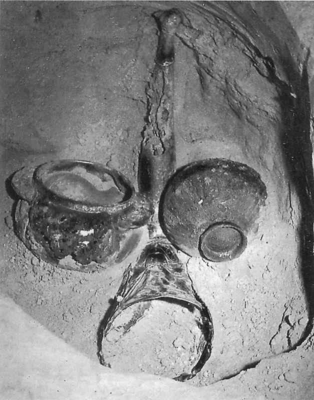 Схованка під час розкопок. Фото Г.Т.Ковпаненко. Десять золотих і срібних посудин лежали одна…