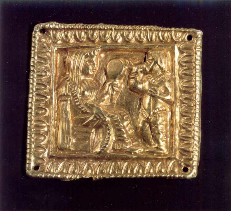 Бляшка з ритуальної сценою: скіф п’є перед богинею