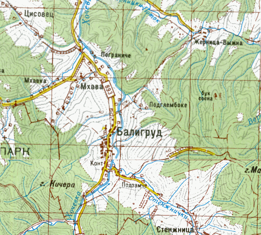 Карта (Балігруд)Розмір зображення: 900:811 піксел Карта Київської військово-картографічної фабрики, масштаб 1:100000, аркуш 106, друк 2001 р. (за матеріалами 2000 р.). |