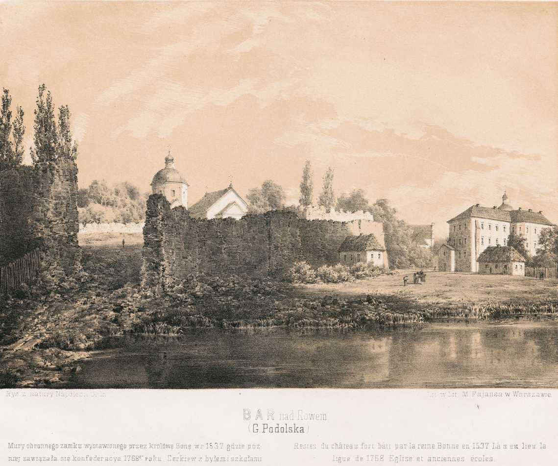 Ruiny zamku królowej Bony. Widok pozostałości murów zamkowych; za nimi fragment kościoła z kopu… strony klasztor pojezuicki. 1871—1873. Dat.: 28 Lipca Bar. Napis na podkład dolska Bar, – ruiny zamku; napis na kartce doklejonej do podkładu: Bar (G. Podolska). Mury obronnego zamku wystawionego przez królowę Bonę, gdzie później zawiązała się konfederacya 1768 roku. Kościół Bazyljanów Cerkiew z bylemi szkołami. Rys. ołówkiem podmalowany akwarelą, 19,4x27,5. III-r.a. 2934 (Teka Podole). Bibl.: Album widoków, seria III, il. 104 [Katalog rysunków architektonicznych ze zbiorów Muzeum narodowego w Krakowie. 1. Rysunki Napoleona Ordy / Opracowały Zofia Kucielska i Zofia Tobiaszowa. – Warszawa: Państwowe wydawnictwo naukowe, 1975, Nr. 22]