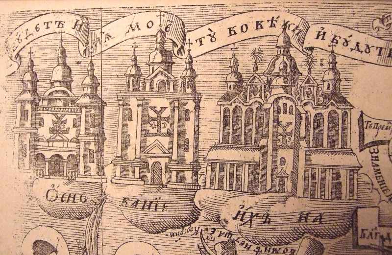 Ліва група храмів (?; собор Микільського монастиря в Києві ? Успенський собор Києво-Печерської лаври)