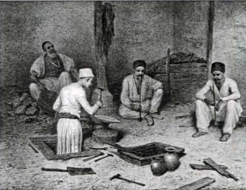 1837 р. Циганська кузня у БахчисараїРозмір зображення: 800:620 піксел Літографія О. Раффе, 1837 р. [Ибрагимова А. И. Бахчисарайский ханский дворец 16 – 18 вв. – К.: 2015 г., c. 72, рис. 45]. |