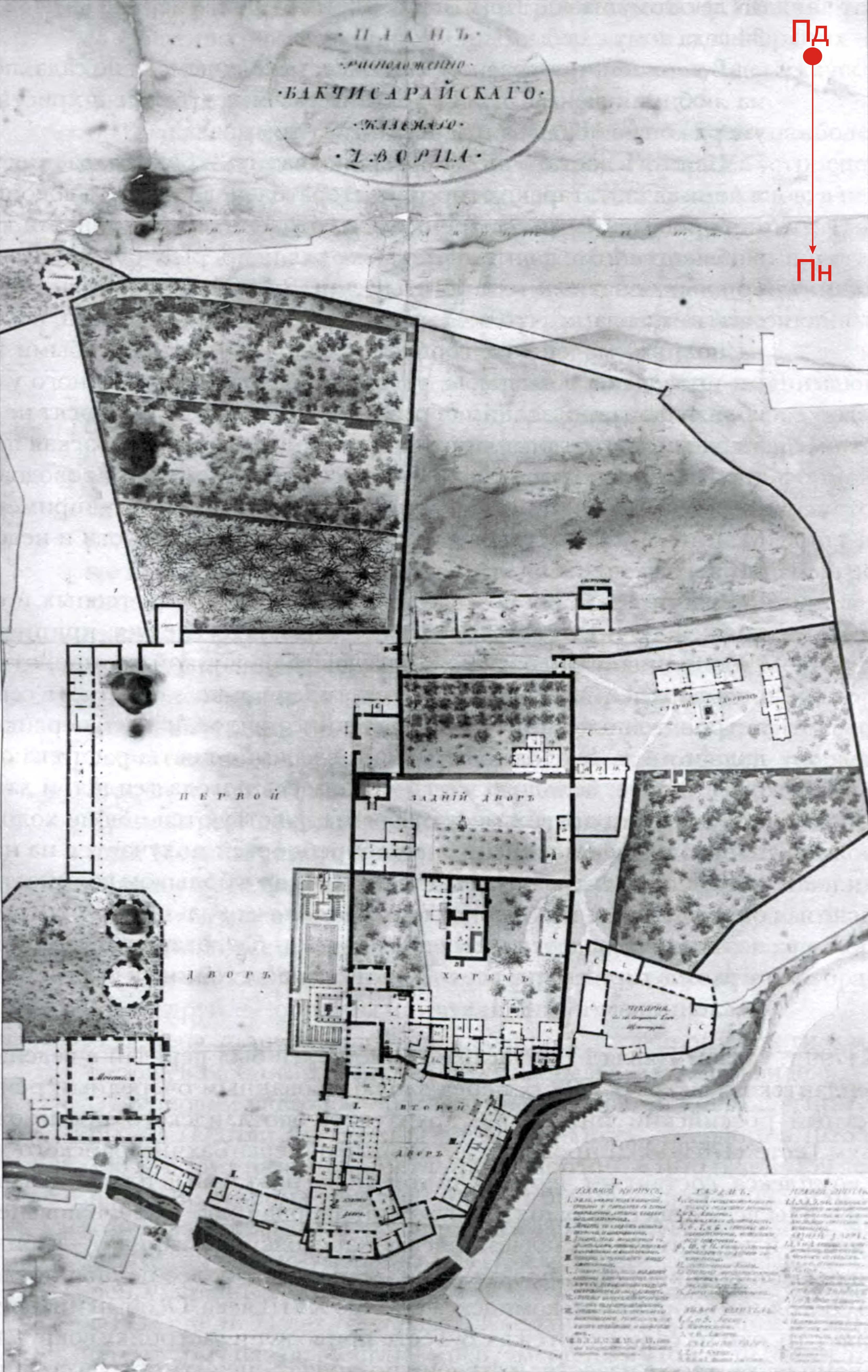 1798 р. План першого поверхуРозмір зображення: 3317:5242 піксел План першого поверху В. Гесте, 1798 р., 1-й варіант [Ибрагимова А. И. Бахчисарайский ханский дворец 16 – 18 вв. – К.: 2015 г., c. 32, рис. 10]. |