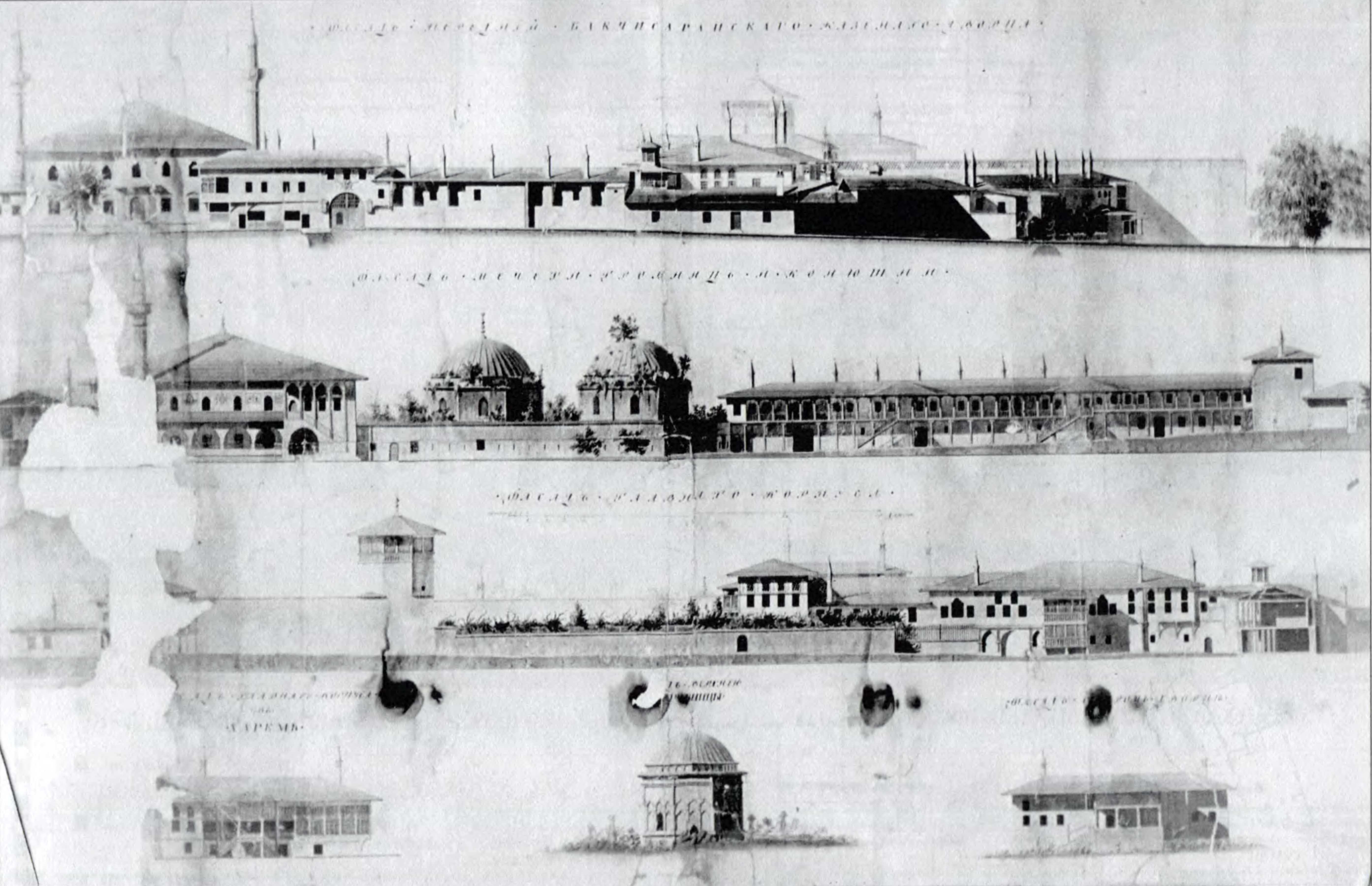 Розгортки фасадів. Фіксаційні креслення В. Гесте, 1798 р. [Ибрагимова А. И. Бахчисарайский ханский дворец 16 – 18 вв. – К.: 2015 г., c. 36, рис. 14].