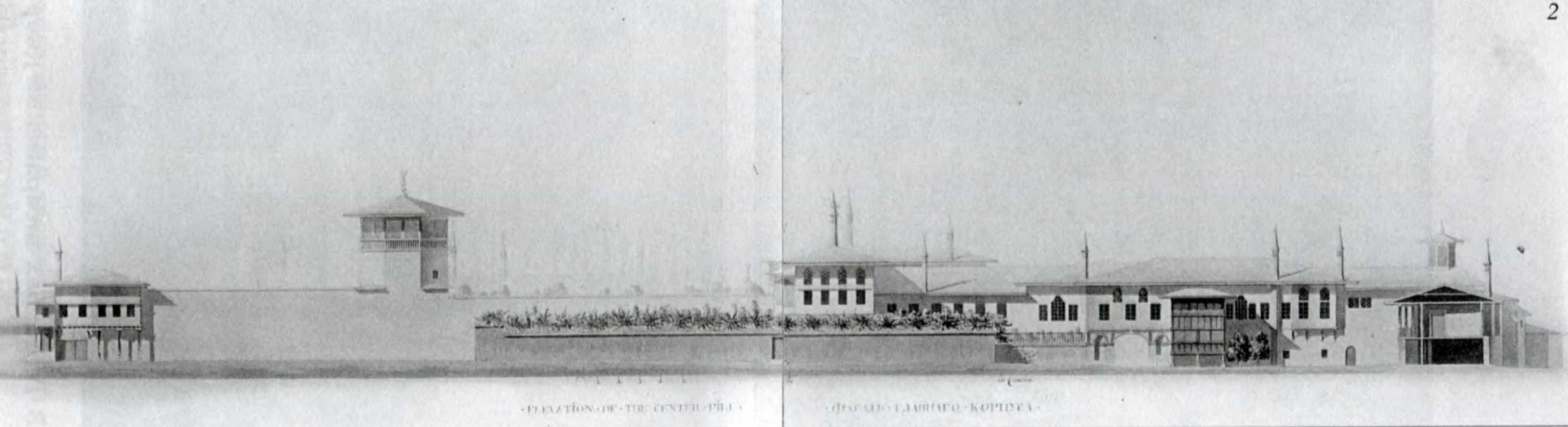 1798 р. Фасад західної перії, проект реставраціїРозмір зображення: 2771:754 піксел Фасад західної перії, проект реставрації В. Гесте, 1798 р. [Ибрагимова А. И. Бахчисарайский ханский дворец 16 – 18 вв. – К.: 2015 г., c. 39, рис. 17-2]. |