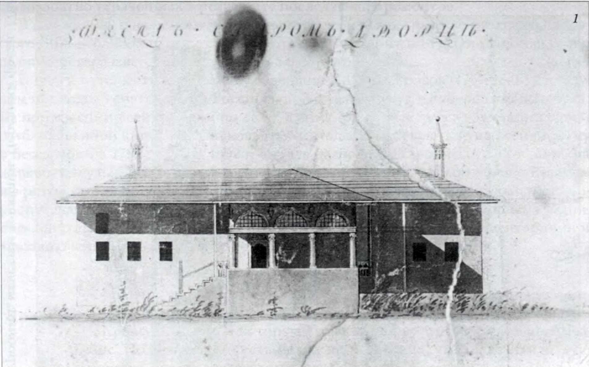 Головний фасад, фіксація В. Гесте, 1798 р. [Ибрагимова А. И. Бахчисарайский ханский дворец 16 – 18 вв. – К.: 2015 г., c. 41, рис. 19-1].