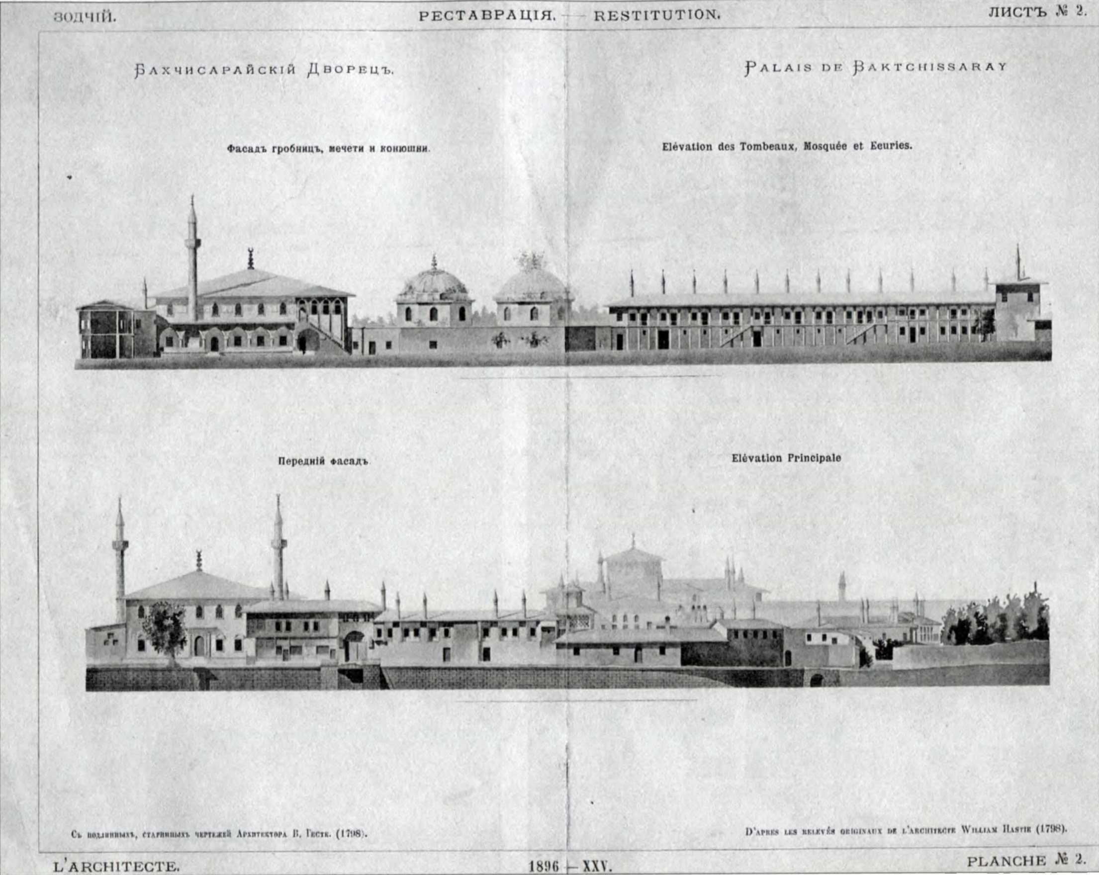 Фасад східної перії (вгорі); північний фасад (внизу). Проект реставрації В. Гесте, 1798 р. [Ибрагимова А. И. Бахчисарайский ханский дворец 16 – 18 вв. – К.: 2015 г., c. 42, рис. 20].
