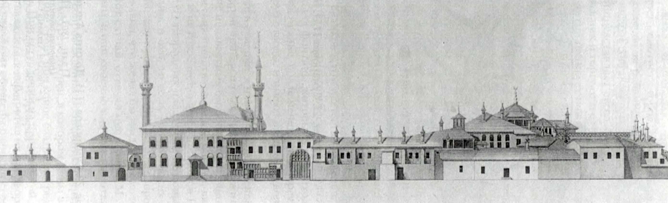 1803 р. Північний фасадРозмір зображення: 2780:847 піксел Тенилов. Північний фасад палацу, 1803 р. [Ибрагимова А. И. Бахчисарайский ханский дворец 16 – 18 вв. – К.: 2015 г., c. 46, рис. 24]. |