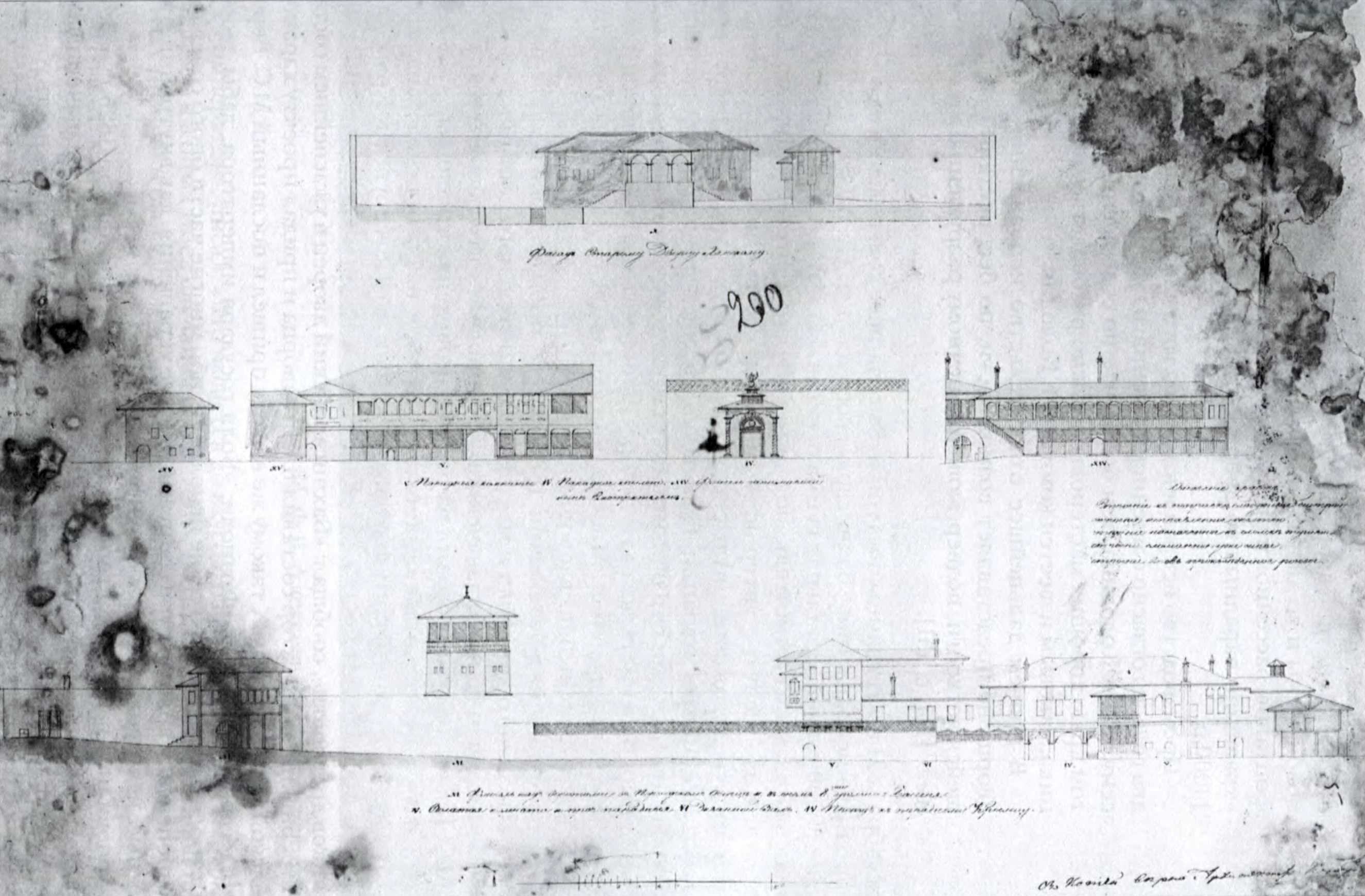 Колодін І. Ф. Південний фасад Старого палацу, західний фасад головного корпусу, парадний ганок, корпус варти (?), східний фасад головного корпусу. 1820 р. [Ибрагимова А. И. Бахчисарайский ханский дворец 16 – 18 вв. – К.: 2015 г., c. 61, рис. 35].