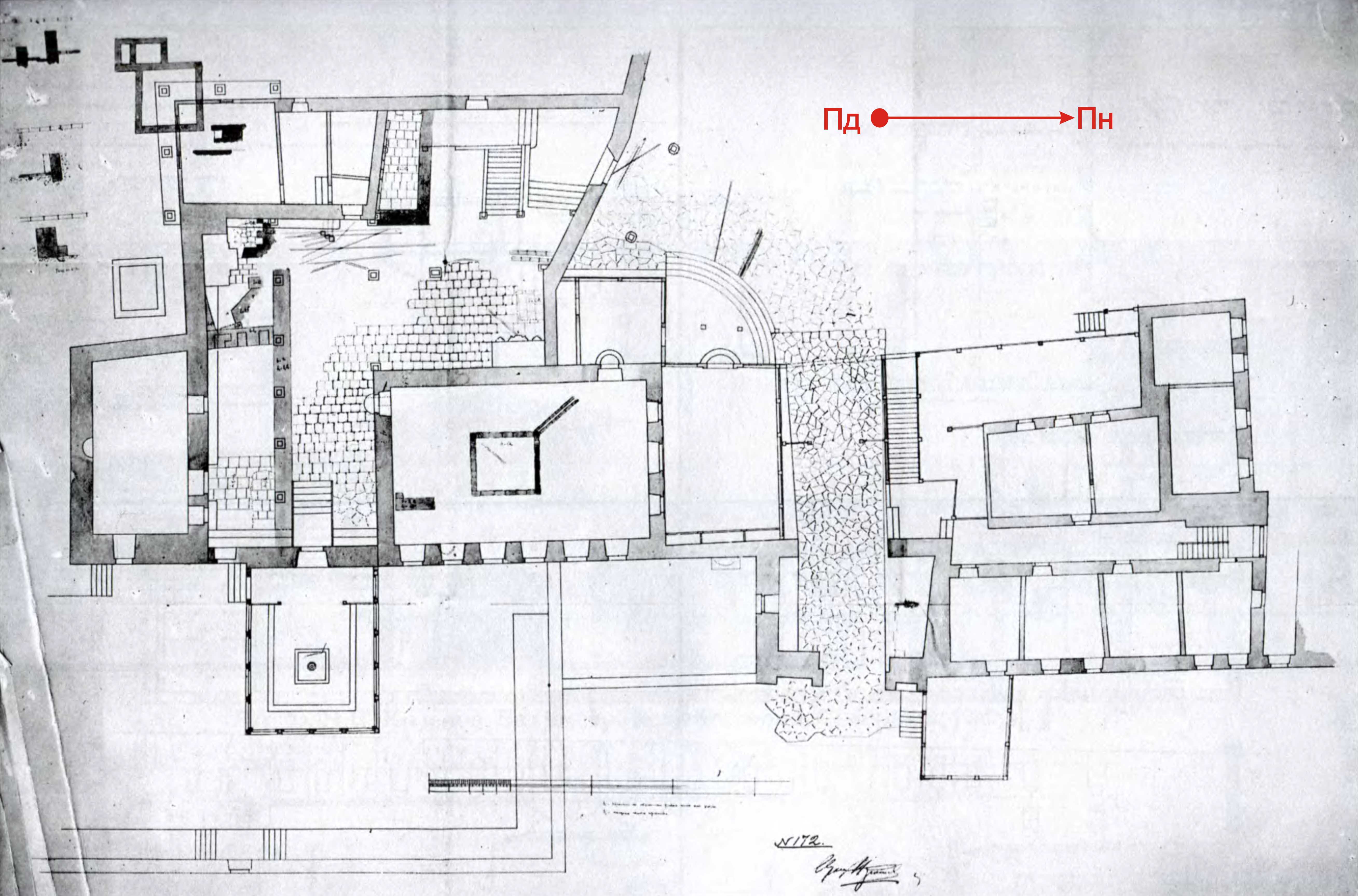 Краснов М. П. План 1-го поверху з позначенням фрагментів давньої підлоги, 1894 р. [Ибрагимова А. И. Бахчисарайский ханский дворец 16 – 18 вв. – К.: 2015 г., c. 79, рис. 51].