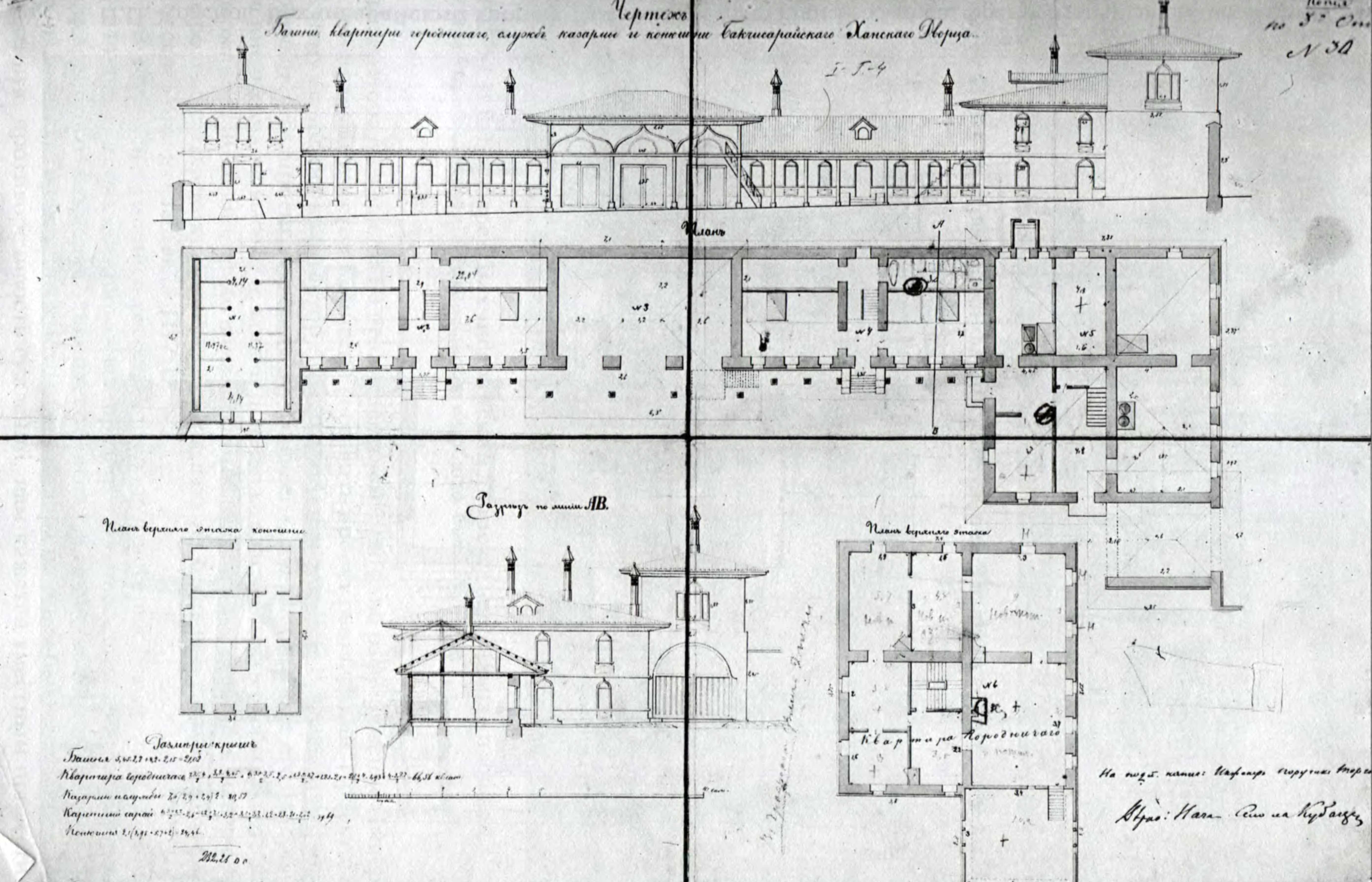 1894 р. Стайні та бібліотекаРозмір зображення: 5575:3584 піксел Краснов М. П. Західний фасад і план стаєнь; план 2-го поверху бібліотеки. 1894 р. [Ибрагимова А. И. Бахчисарайский ханский дворец 16 – 18 вв. – К.: 2015 г., c. 80, рис. 52]. |