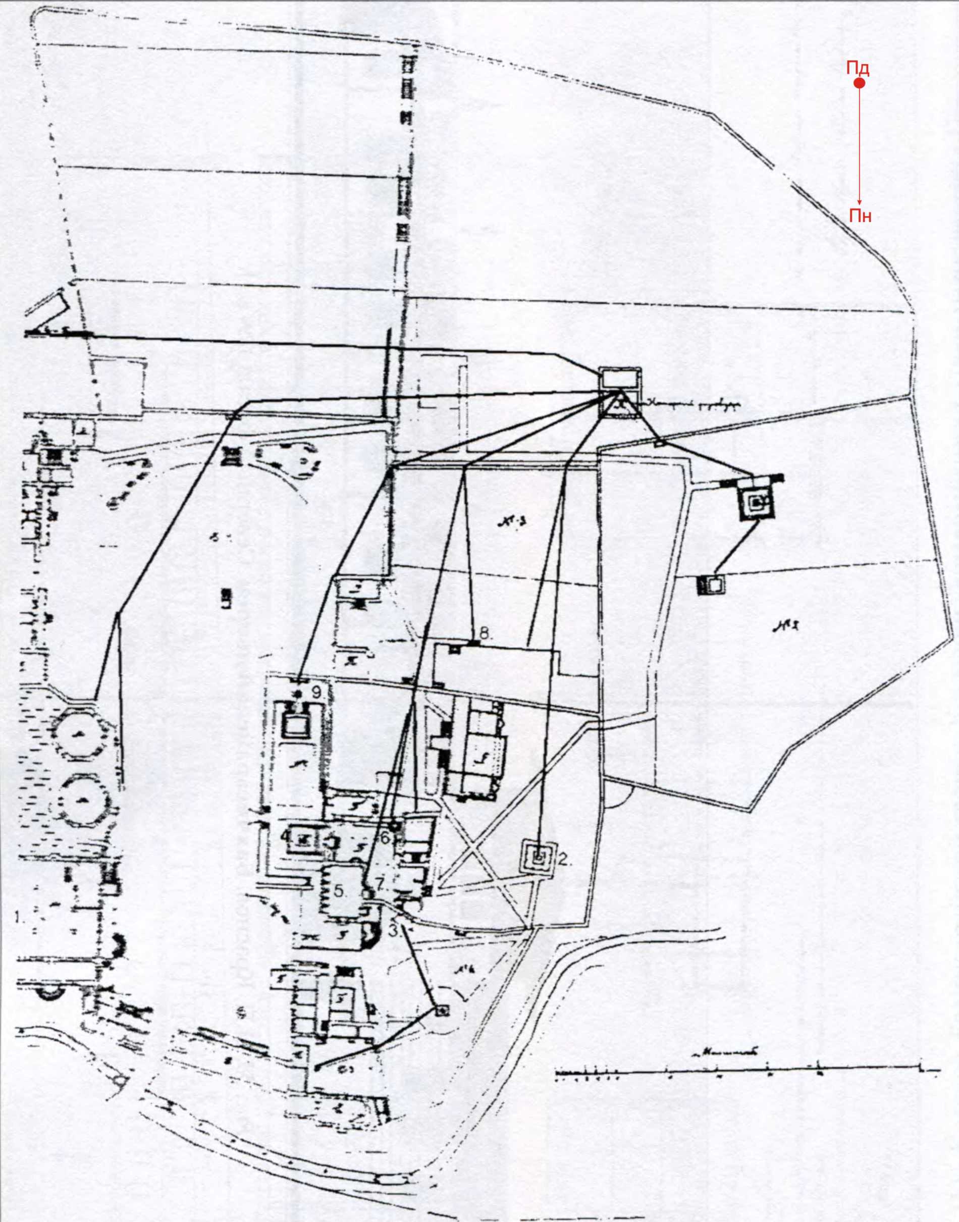 Краснов М. П. План палацу з позначенням водогонів. 1894 р. [Ибрагимова А. И. Бахчисарайский ханский дворец 16 – 18 вв. – К.: 2015 г., c. 82, рис. 54].