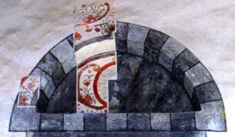 Фрагмент розпису наличника мечеті. Розкрито нашарування різного часу. Фото О. Гайворонського, 2012 р. [Гайворонський О. Країна Крим. – К.: Майстер книг, 2017 р., c. 98b]