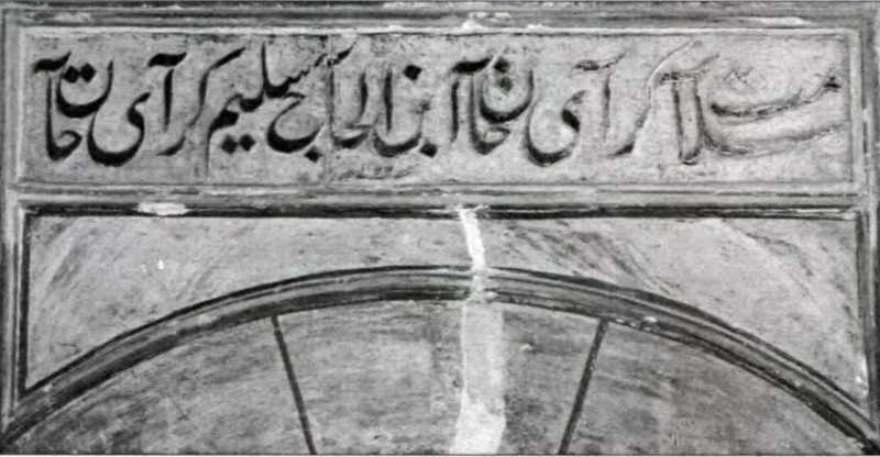 Напис над входом до малої мечетіРозмір зображення: 800:416 піксел Фото А. Ібрагімової, 2013 р. [Ибрагимова А. И. Бахчисарайский ханский дворец 16 – 18 вв. – К.: 2015 г., c. 114, рис. 100]. |