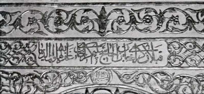 Орнамент і верхній написРозмір зображення: 800:371 піксел Фото А. Ібрагімової, 2013 р. [Ибрагимова А. И. Бахчисарайский ханский дворец 16 – 18 вв. – К.: 2015 г., c. 121, рис. 112]. |