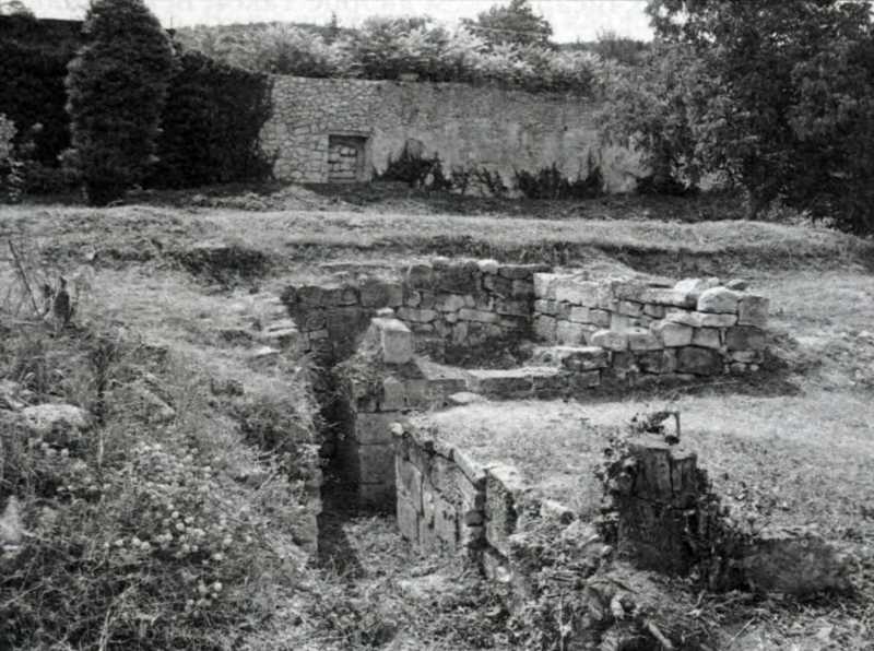 На передньому плані – залишки зруйнованої в 19 ст. лазні, на задньому плані ліворуч – залишки альтанки, прямо – фіртка до саду. Фото А. Ібрагімової, 2013 р. [Ибрагимова А. И. Бахчисарайский ханский дворец 16 – 18 вв. – К.: 2015 г., c. 165, рис. 187].