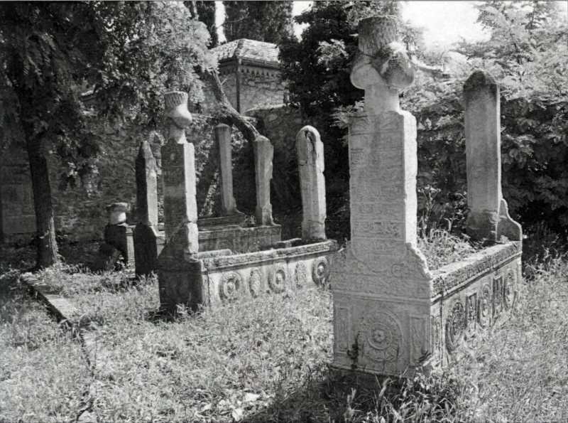Зліва направо: невідоме поховання, надгробки Хаджі-Гірей-султана, Азамат-Гірей-султана, Ахмед-Гірей-султана. На тлі лазні Сари-Гюзель. Фото А. Ібрагімової, 2013 р. [Ибрагимова А. И. Бахчисарайский ханский дворец 16 – 18 вв. – К.: 2015 г., c. 173, рис. 195].