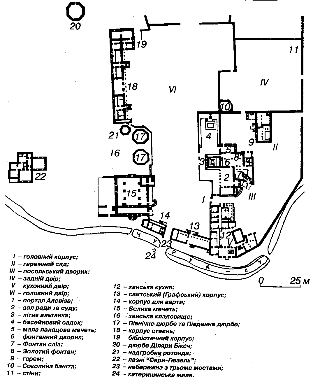 Споруди комплексу групуються навколо головного двору з меридіональною орієнтацією поздовжньої осі. Його північний бік формують корпуси для варти та для свити, західний – головний корпус з прибудовами, південний – мури, східний – Велика мечеть, ханське кладовище з Північним та Південним дюрбе, стайні та бібліотечний корпус. Суміжно з західним боком головного двору розміщуються відокремлені мурами кухонний двір, посольський дворик, гаремний сад та задній двір. Окремо від комплексу поставлені лазні “Сари-Гюзель” (зі сходу) та дюрбе Діляри-Бікеч (з південного сходу). З правим берегом річки палац сполучений трьома мостами перед головним північним фасадом.