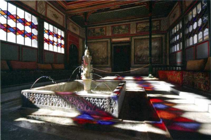 Летняя беседка. Построена Омером в середине XVIII в. Арки, обрамляющие беседку с трех сторон, в начале были открытыми. Во время ремонта арочные проемы застеклили цветными стеклами. Потолок беседки резной, работы русского мастера Василия Дорофеева. Люстра XVIII в. изготовлена в Петербурге. В центре беседки – мраморный фонтан турецкой работы, вдоль стен – широкие диваны с подушками. [Памятники градостроительства и архитектуры УССР. – К.: Будівельник, 1985 г., т. 2, с. 314 – 315).