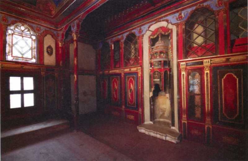 Золотой кабинет. Расположен над летней беседкой. Небольшая по размерам комната освещается 24 окнами, размещенными в два яруса. На верхних окнах витражи. Зал был расписан Омером, живопись сохранилась под позднейшей покраской. В простенках между окнами – алебастровые изображения подносов и ваз с фруктами. Потолок резной, в центре его – плафон с резными украшениями в виде листьев и плодов граната. Люстра работы XVIII в. Название объясняется наличием большого количества позолоты в отделке. [Памятники градостроительства и архитектуры УССР. – К.: Будівельник, 1985 г., т. 2, с. 314 – 315).