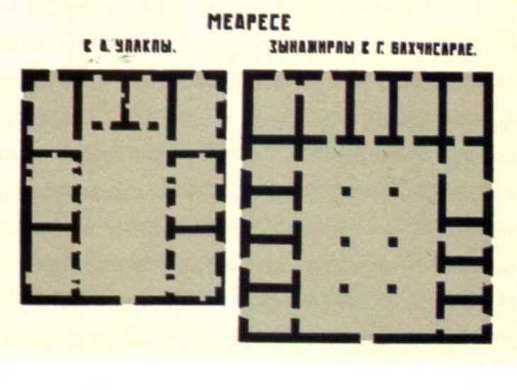 Плани медресе у с. Улакли та Зінджирли-медресе у Бахчисараї. Креслення Б. Засипкіна, 1928 р. [Гайворонський О. Країна Крим. – К.: Майстер книг, 2017 р., c. 211]